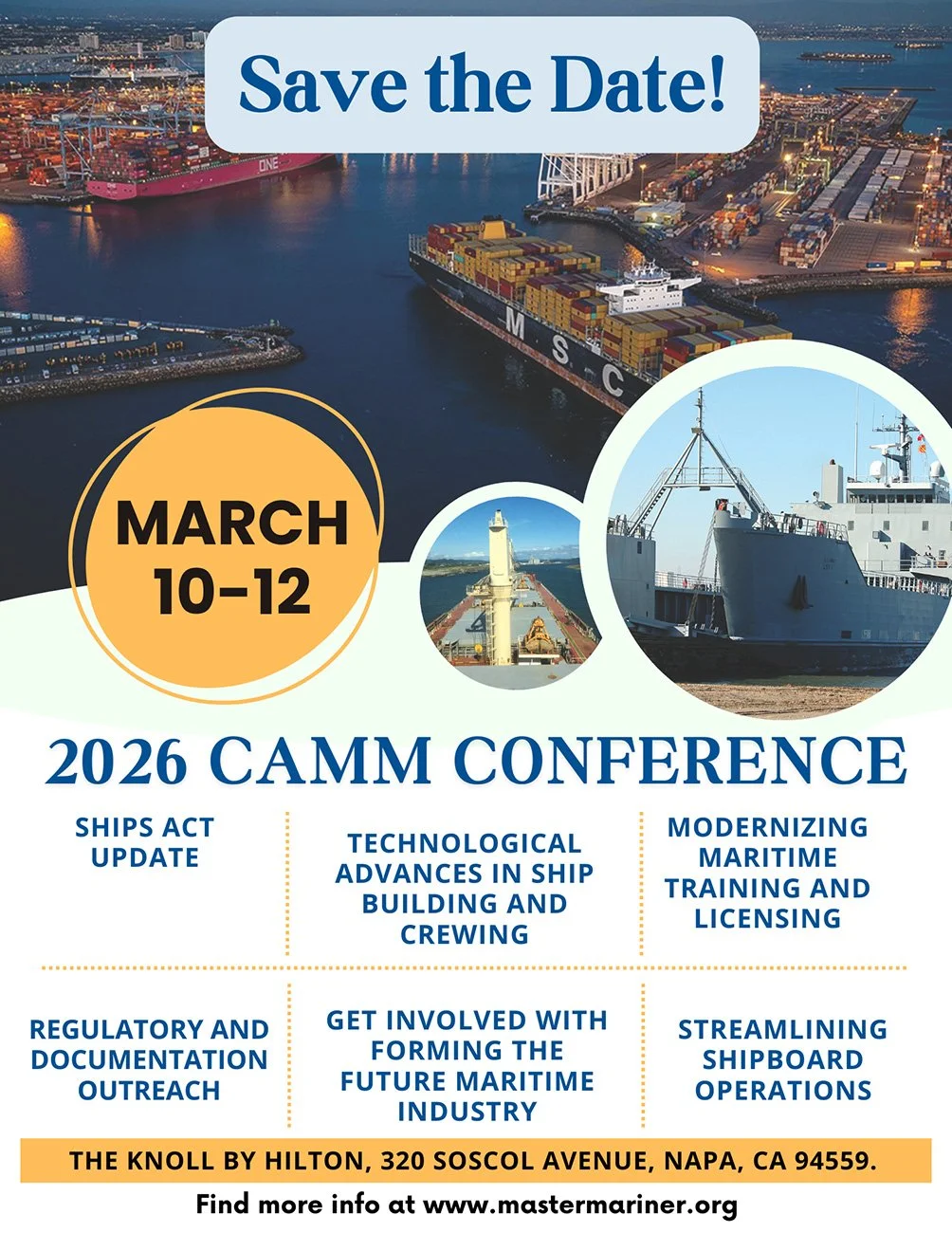 The Professional Development Conference is open to the public, and attendees are encouraged to promote the event and CAMM to fellow mariners. Evening dinners and guest outings are also open to participants, fostering camaraderie and professional connection.