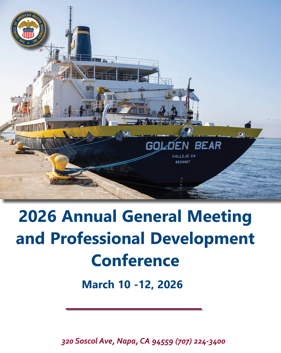 The Council of American Master Mariners is a non-profit organization of mariners supporting mariners. The annual conference provides essential updates on credentials, vessel operations, training, regulations, and issues affecting Masters and Pilots. Sponsors help make this program possible.